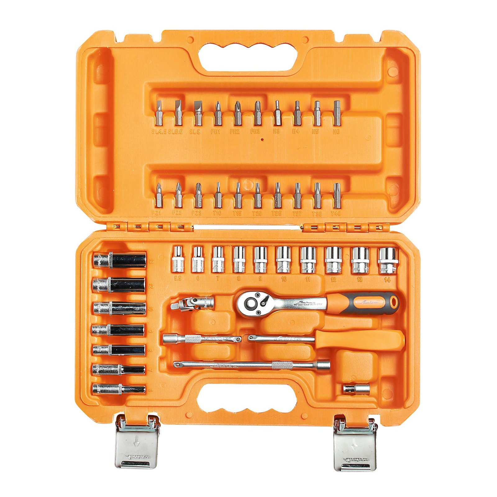 1. Головка торцевая 6гр. 5.5, 6, 7, 8, 9, 10, 11, 12, 13, 14 Головка торцевая удлинённая 6гр. 6, 7, 8, 9, 10, 12, 13 Бита шестигр. H3, H4, H5, H6 Бита PZ PZ 1, PZ 2, PZ 3 Бита PH PH 1, PH 2, PH 3 Бита шлиц SL 4.5, SL 6.5, SL 8.0 Бита TORX TX 10, TX 15, TX 20, TX 25, TX 27, TX 30, TX 40 Трещёточная рукоятка 1/4", 72 зуба Отвёрточная рукоятка 1/4" - 1/4" Удлинитель 75мм, 150мм Карданный шарнир 1/4" Держатель для бит 1/4" - 6,35мм