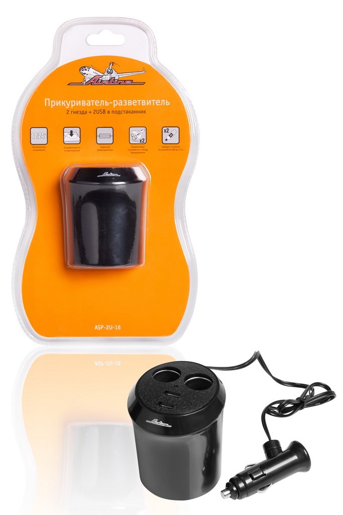 прикуриватель-разветвитель Airline в подстаканник 2 гнезда, 2 USB, вит. шнур (12В, 8А, 100Вт) ASP-2U-16